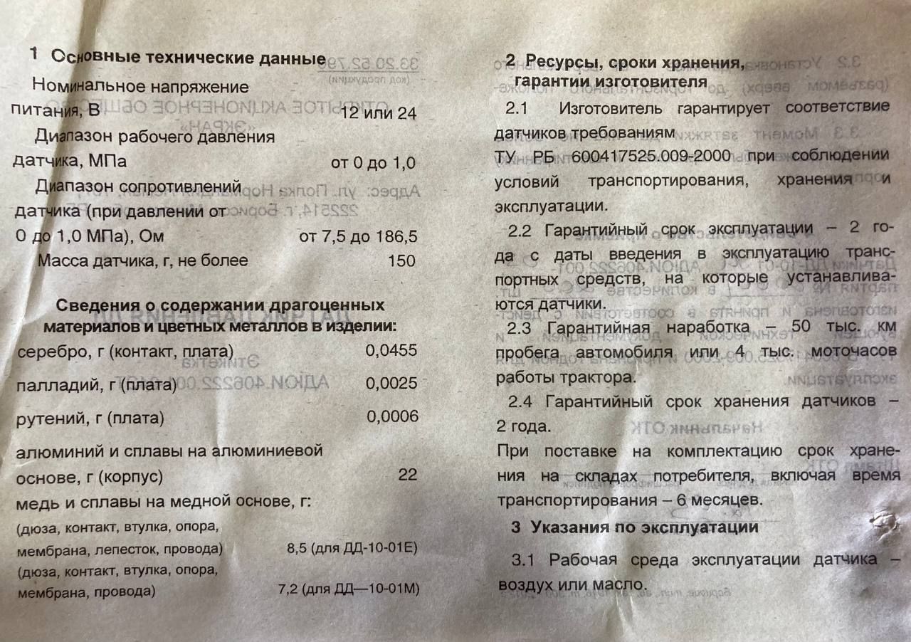 95% напрацювання на відмову датчиків для першої категорії умов експлуатації встановлюється не нижче 600 000 км пробігу автомобіля або 12000 мотогодин роботи трактора.